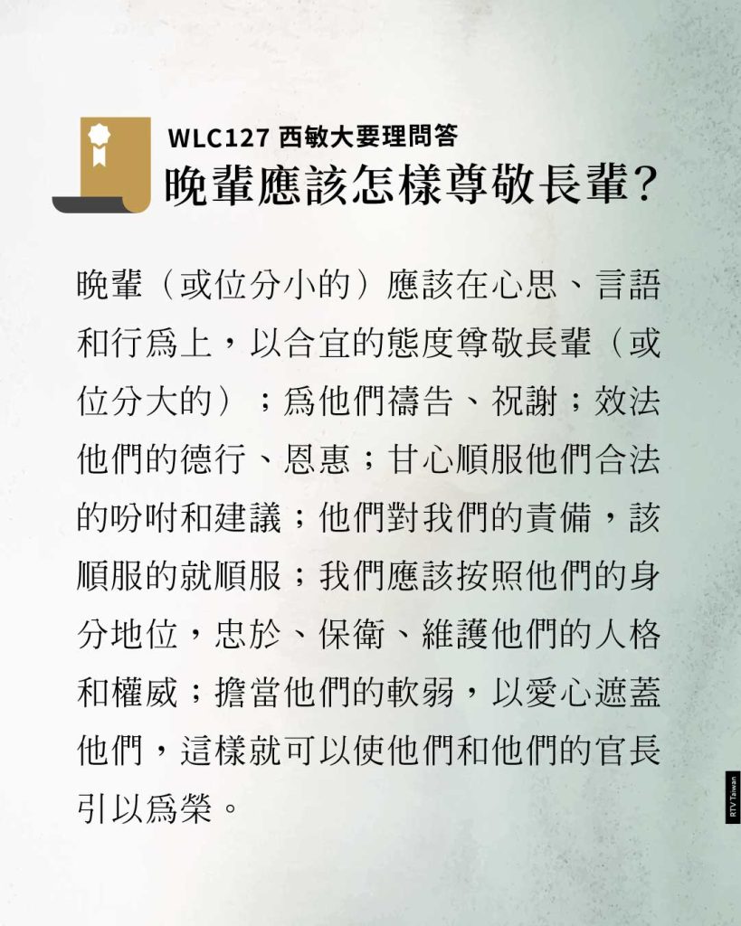 尊崇的敬畏與蒙福的盼望晚輩對於長輩所當盡的尊榮包括:「在心思、言語與行為上,向長輩表達當有的敬重;為他們禱告並感謝;效法他們的美德與恩典;甘心順服他們合法的命令與勸告;適度順從他們的管教;並按著他們不同的身分與職分,忠心維護與支持他們的位分與權柄……」(參大要理問答127)。