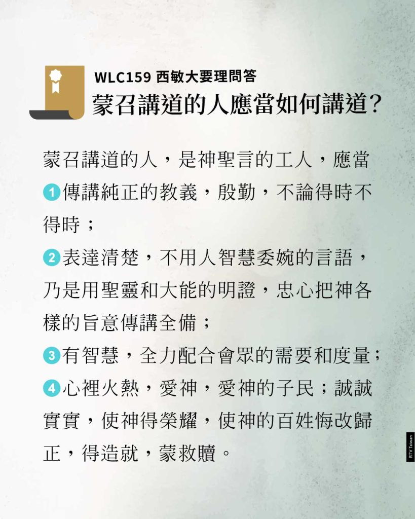 他們要傳講純正的教義,殷勤不倦,無論得時不得時;清楚明白,不用人智慧的誘人言語,乃在聖靈和能力的明證中;忠心 不二,將神全備的旨意宣明;有智慧地按著聽眾的需要與領受能力 施教;心中火熱,以愛神並愛祂百姓的靈魂為念;並以真誠為目標,使神得榮耀,使人得歸正、得建立 、得救恩。──西敏大要理問答第159問