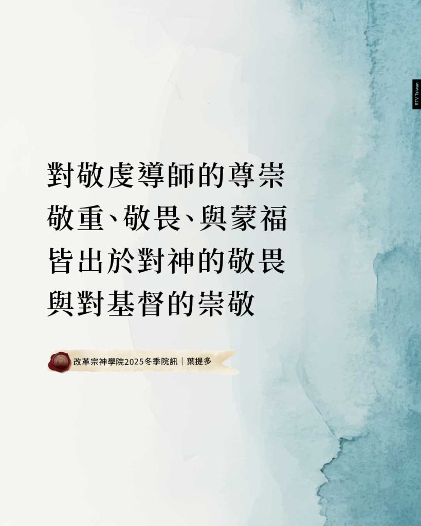 保羅對導師與門徒的教導也呈現相同的主題:「弟兄們,我們勸你們敬重那在你們中間勞苦的人,就是在主裡面治理你們、勸戒你們的;又因他們所作的工,格外尊重他們,以為配得。」(帖前五12-13)所有應歸於敬虔導師的尊崇、敬重、敬畏與蒙福盼望,皆出於對神的敬畏與對基督的崇敬,因為這些導師是基督忠心的代表,正在服事我們(弗五21-22, 32;六1-9;利十九3, 32;對照瑪一6)。