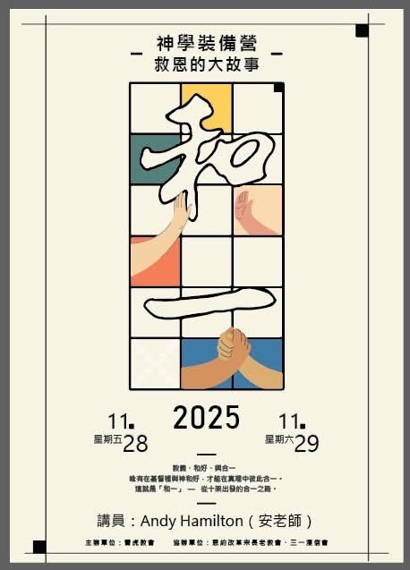 和一|2025神學裝備營(11/28-29台中雷虎教會)精選文章2025-11-20 2025-11-20 2025年神學裝備營 | 救恩的大故事 教義、和好與合一 唯有在基督裡與神和好,才能在真理中彼此合一。 這就是「和一」——從十字架出發的合一之路。 聚會流程 11月28日 | 晚間聚會 5:15pm – 9:40pm 第1場:救恩的必要性 第2場:救恩的源頭 11月29日 | 晨間聚會 9:00am – 1:30pm 第3場:救恩的成就 第4場:救恩的應用 11月29日 | 晚間聚會 6:00pm – 8:45pm 第5場:救恩的福分 第6場:救恩的確據 日期 | 2025/11/28(五)-29(六) 地點 | 雷虎教會大堂 講員 | Andy Hamilton (安老師) 主辦 | 台中雷虎教會 協辦 | 恩約改革宗長老教會、三一浸信會 點我觀看Facebook頁面 請掃描QR CODE或點選下方報名連結按鈕 點我進入報名連結 文章導覽 Previous Post 2025-2026年「耶穌陪妳走」課程(珍愛家庭中心)最新消息2025-11-20Next Post 字字珠璣——細讀以弗所書:創世以前(傅格森)傅格森 博士, 改革宗出版社, 精選文章2025-11-20