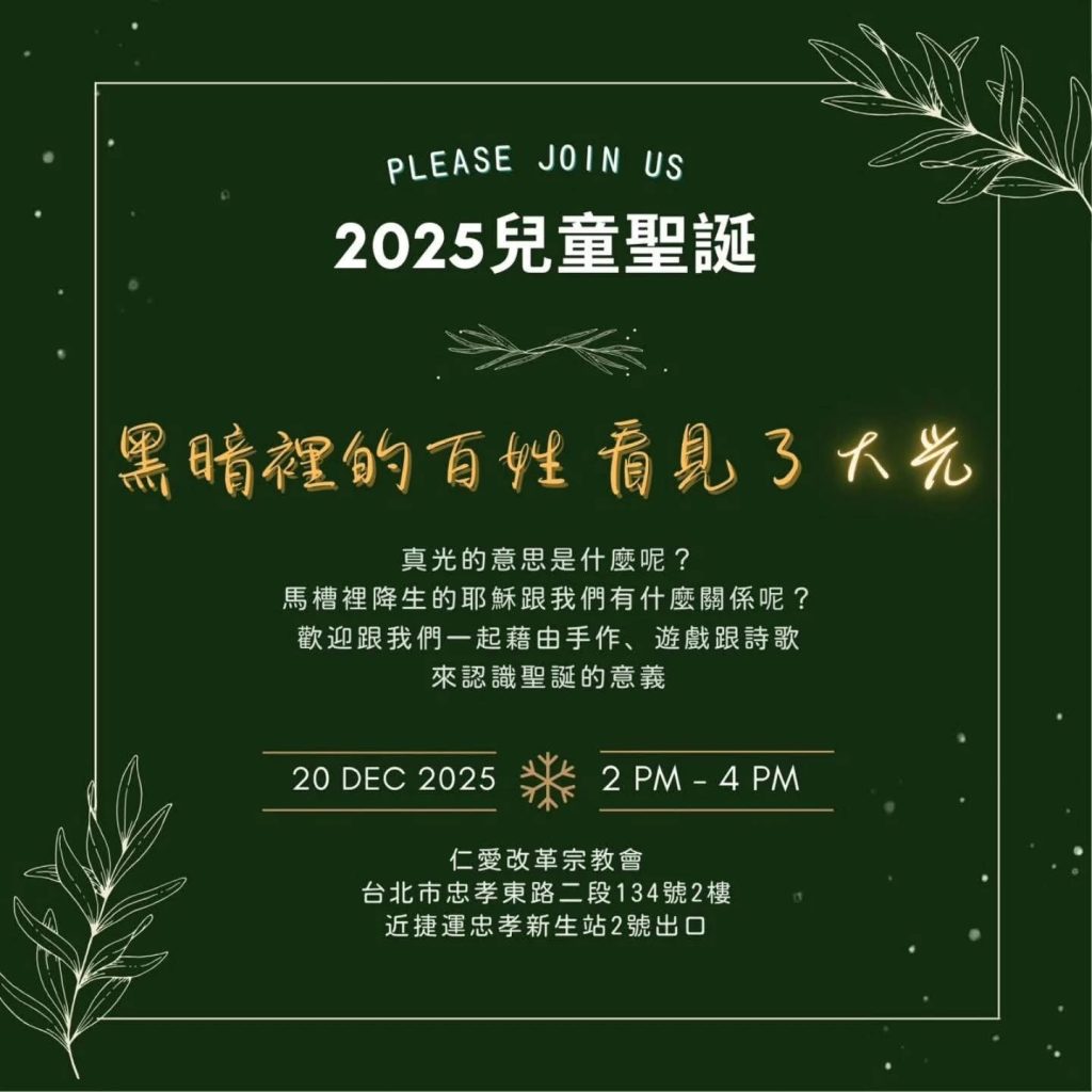 - 地點:仁愛改革宗教會(台北市忠孝東路二段134號2樓|捷運忠孝新生站 2 號出口)