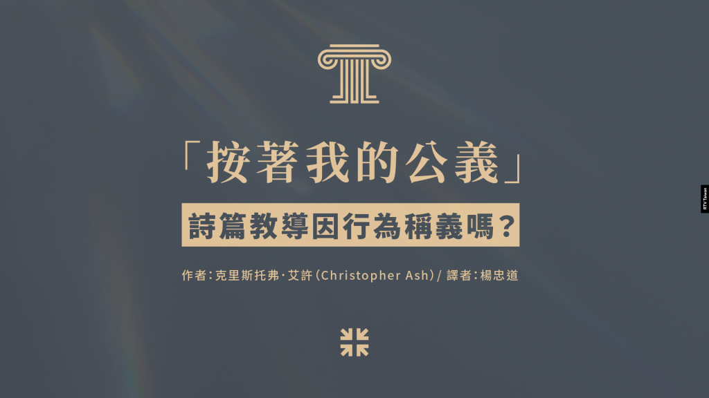 第一,詩篇中非常明顯的是,一切公義的源頭是那「本身就是公義的神」(例如,詩11:7),祂的律法是公義的(例如,詩19:9),他所作的,或施行的公義,是祂聖約信實與慈愛的表達(例如,詩22:31;36:6;48:10;103:6, 17),祂也會以公義審判世界(詩9:8;96:13;98:9)。沒有人天生就有公義,這是立約的主獨有的。