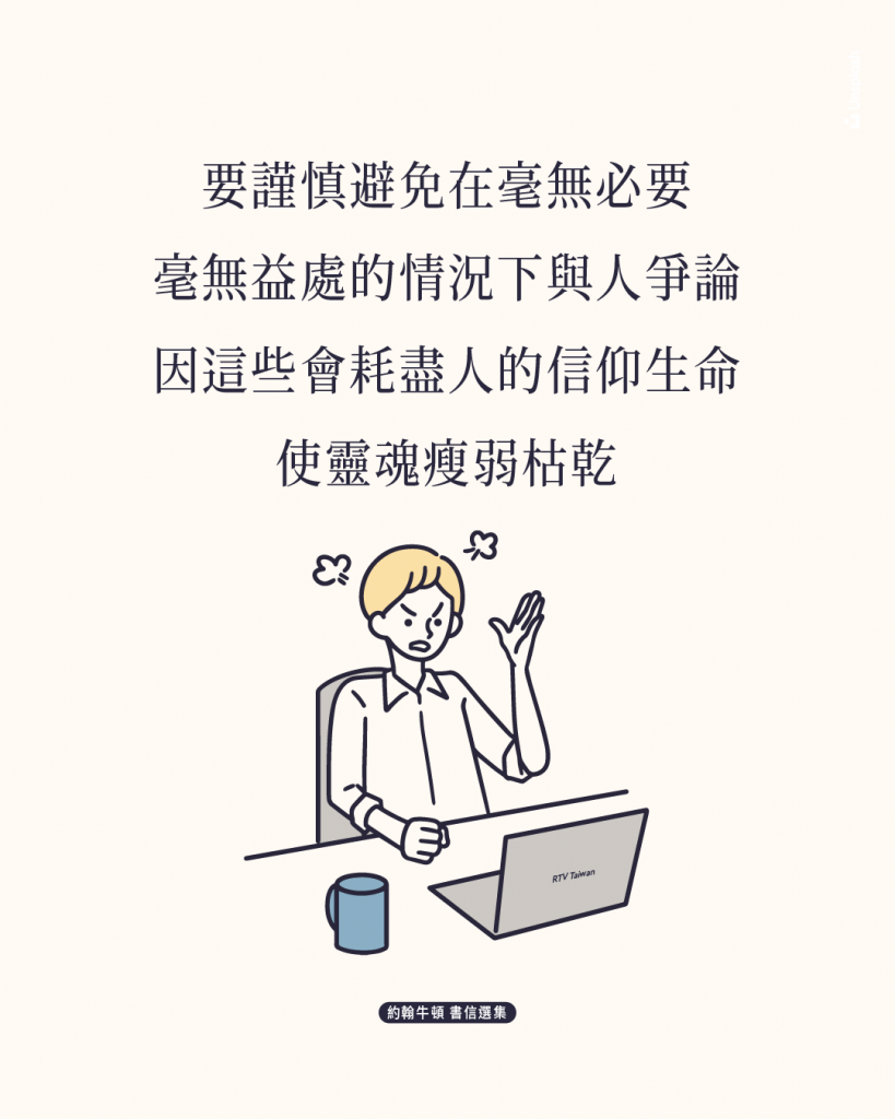 我樂見你厭惡阿民念主義和反律法主義的教義;但不要讓別人的過錯成了你身上的重擔。你要感謝是恩典使你有所不同;並要常作準備,以溫柔、敬畏的心回答各人;更謹慎避免在毫無必要、毫無益處的情況下與人爭論,因這些往往會耗盡人的信仰生命和興趣,使靈魂瘦弱枯乾。當上帝的恩典開始在我們心裡動工,那些不經意發生的錯誤就會隨著時間和經驗加增而減少;否則,不管人們有什麼樣的情感,也不論他們自稱是阿民念的信徒、或是加爾文主義者,都沒什麼意義。