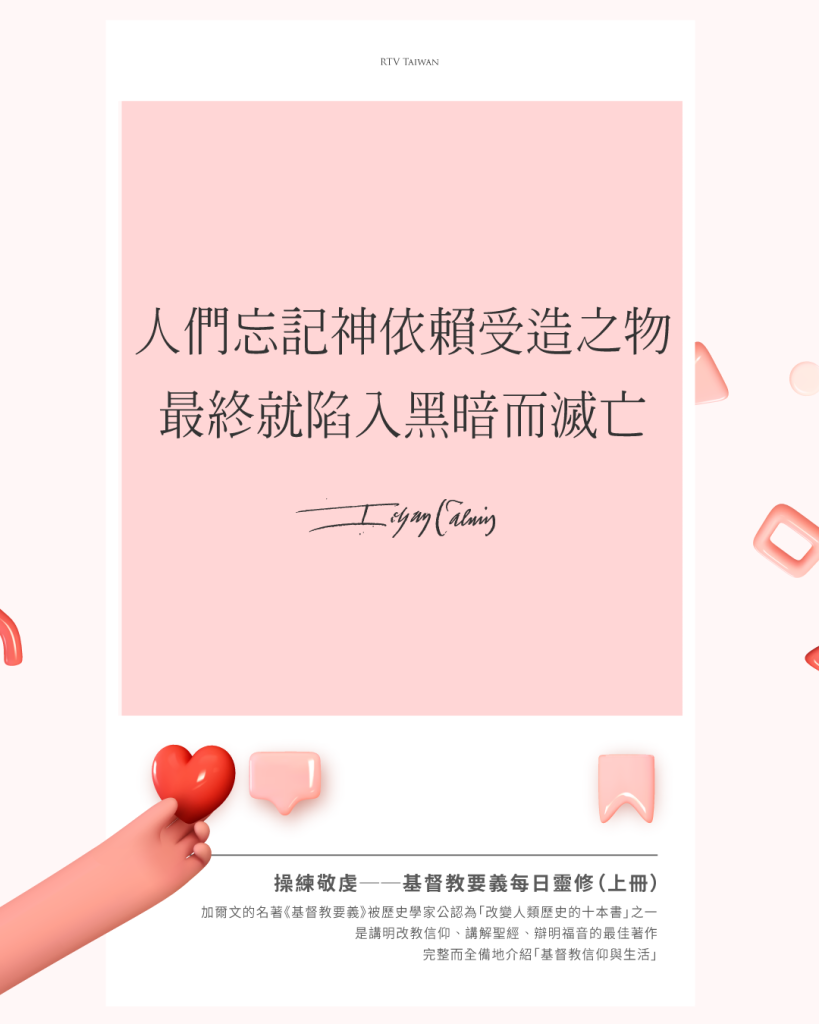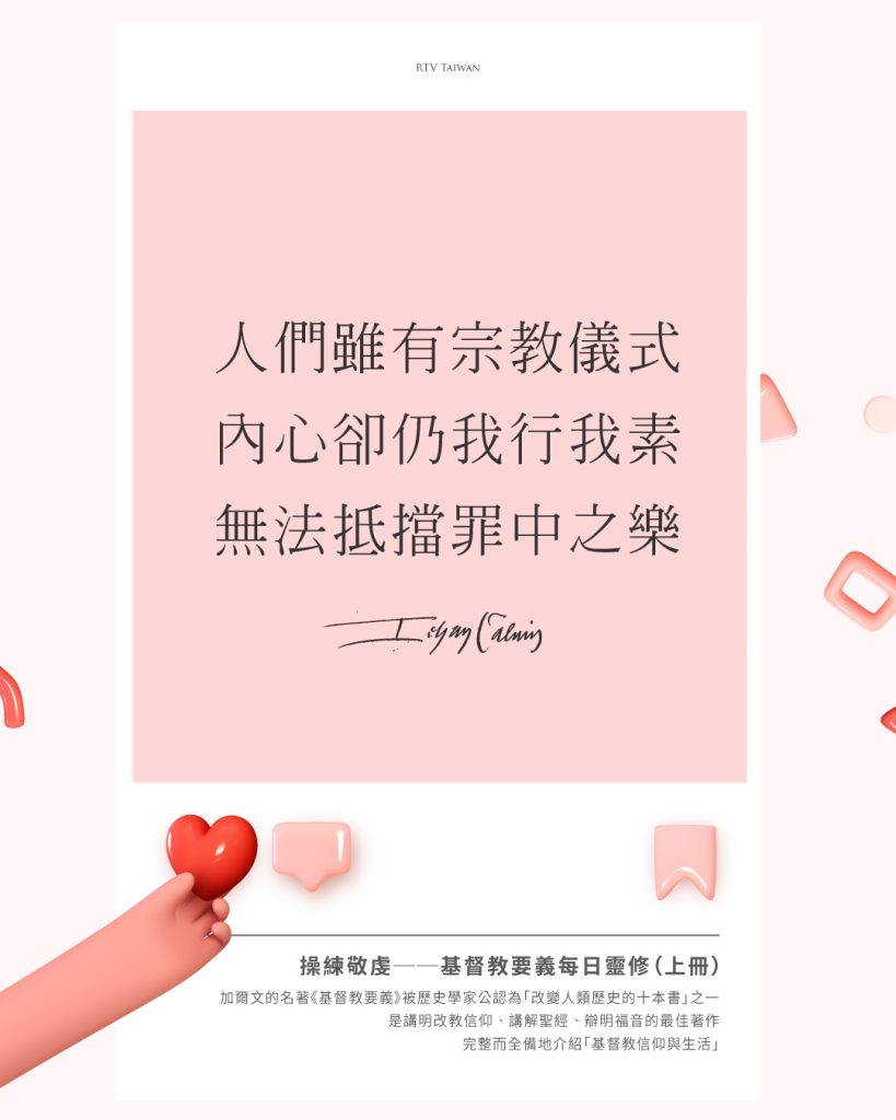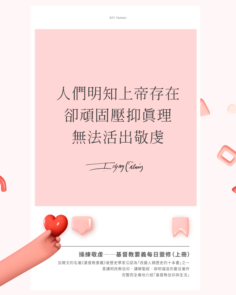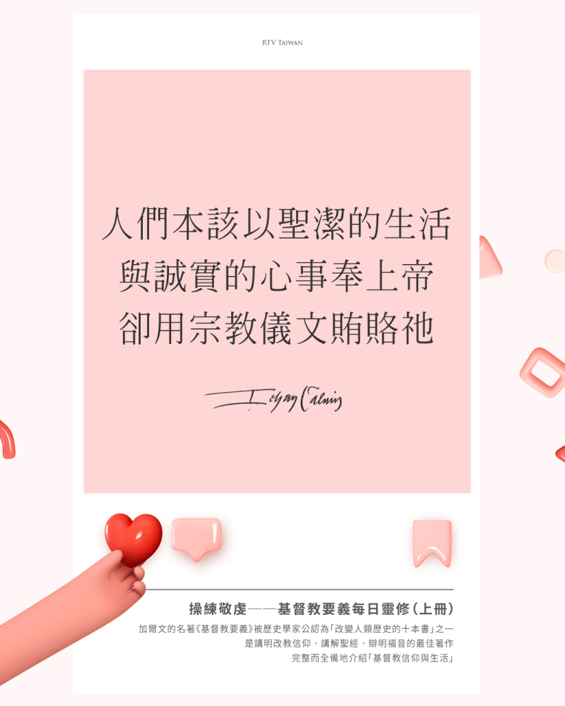 本靈修版取名「操練敬虔」,因為基督徒的靈修必須建立於至聖真道上(猶20),以「純正的信仰」為根基,來操練「敬虔的生活」(彼後1:3-11)。若是不紮根於聖經系統真理,而追求主觀的經歷,則必淪為「有敬虔的外貌,卻達背了敬虔的實意」,甚至「常常學習,終久不能明白真道」(提後3:5-7)。感謝主,如今「基督教要義靈修版」以「操練敬虔」為書名出版,幫助信徒的靈修生活「離開基督道理的開端,竭力進到完全的地步」(來6:1)。讓我們一齊效法加爾文的禱告:「主阿,我願敏捷與誠心所想的,將我的心獻給祢」,開始每日靈修,盡心盡性盡意盡力,學習愛主。主阿,我的心在祢全能手中!
