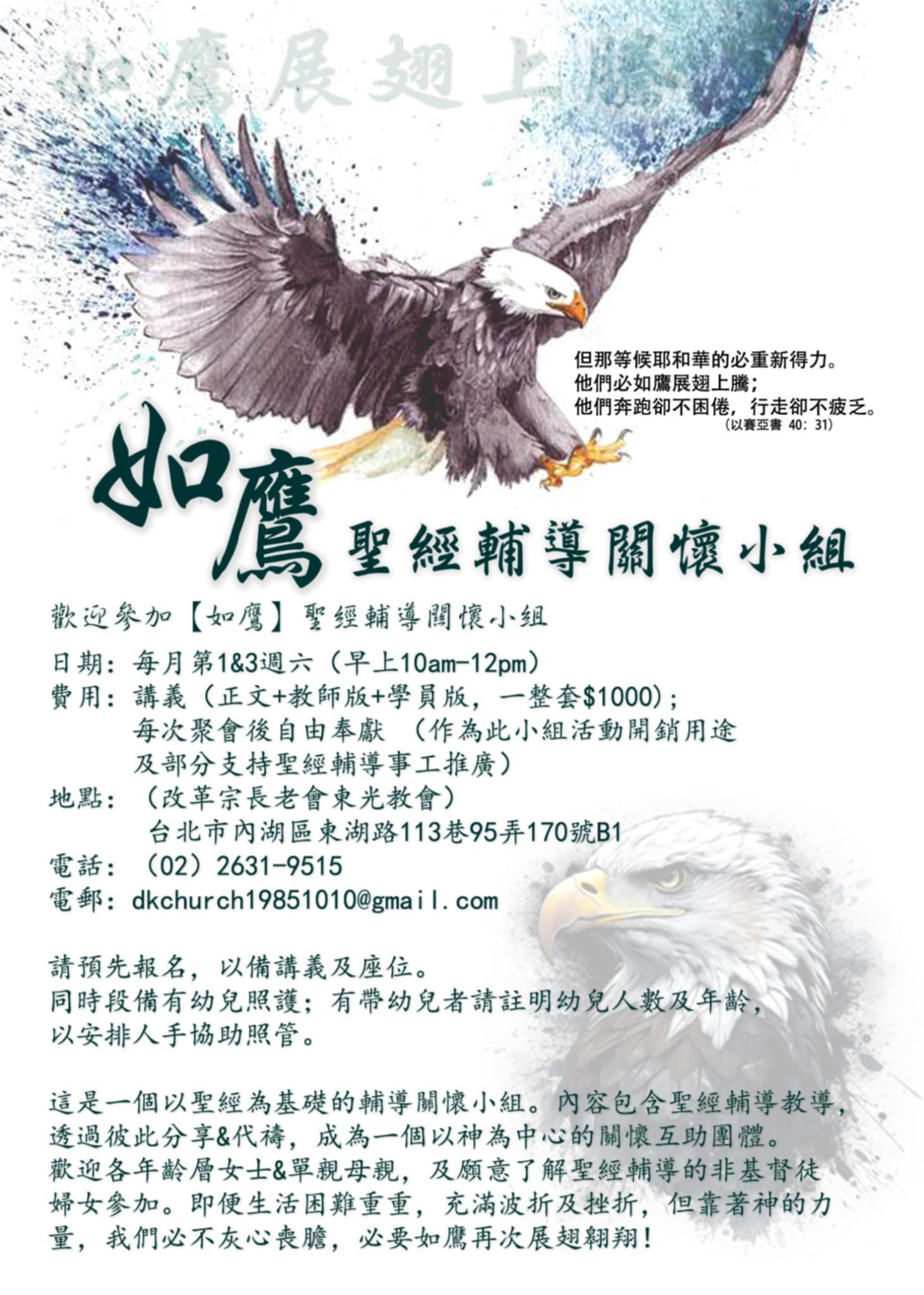 有興趣進一步了解者,歡迎參加「如鷹聖經輔導關懷小組」一同探討之~