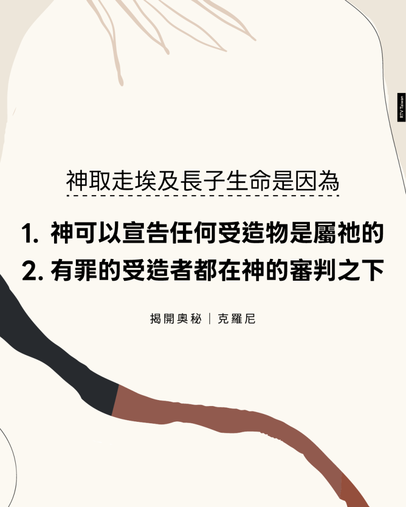 取走長子的生命,是因為兩個很不一樣的原因:第一,神可以宣告任何的受造物是屬於祂的;第二,有罪的受造者都在神的審判之下。審判長子就代表所有人也當受刑罰。如果公義的神要準確地在有罪的埃及人身上施加這個刑罰,那麼有罪的以色列人也不能逃過一劫。世人都犯了罪,虧缺了神的榮耀,埃及人如此,以色列人也是如此。