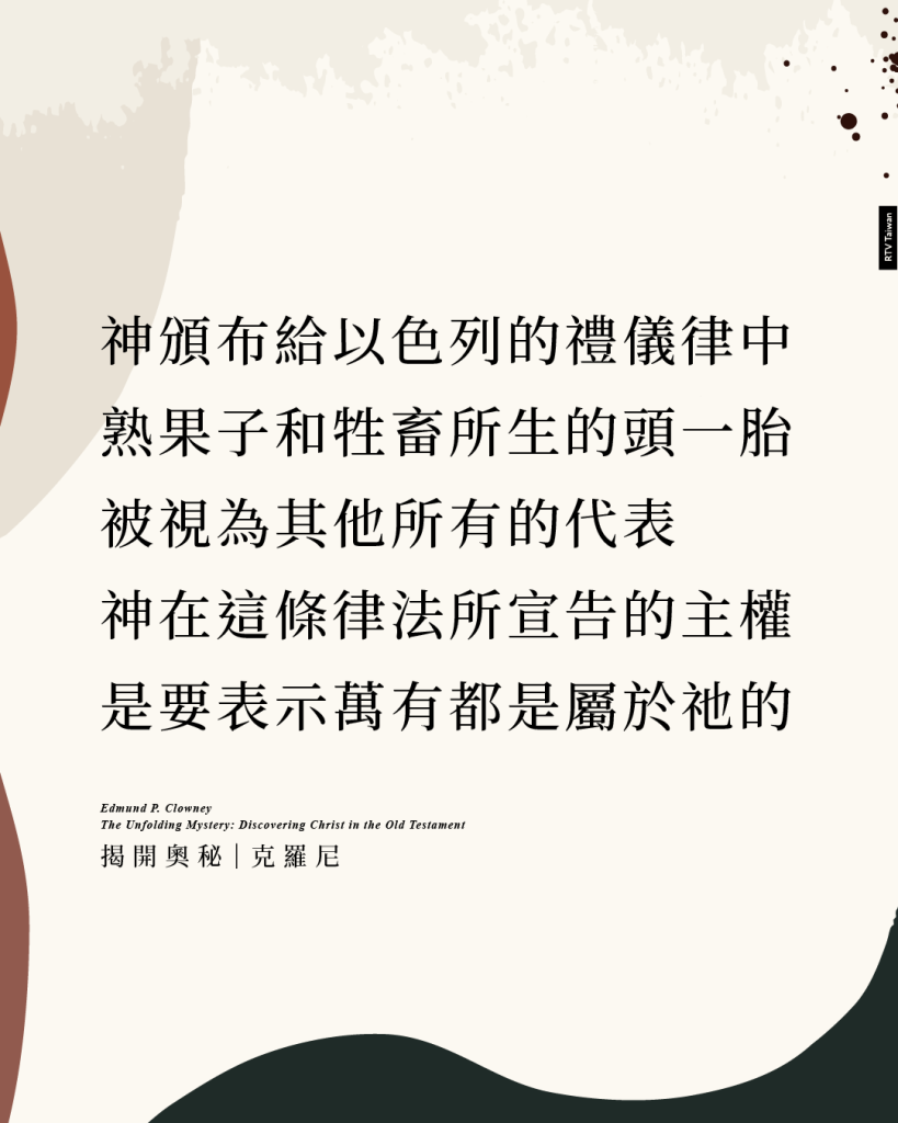 在之後頒佈給以色列人的禮儀律中,初熟果子和牲畜所生的頭一胎被視為其他所有的代表。神在這條律法所宣告的主權,就是要表示萬有都是屬於祂的。