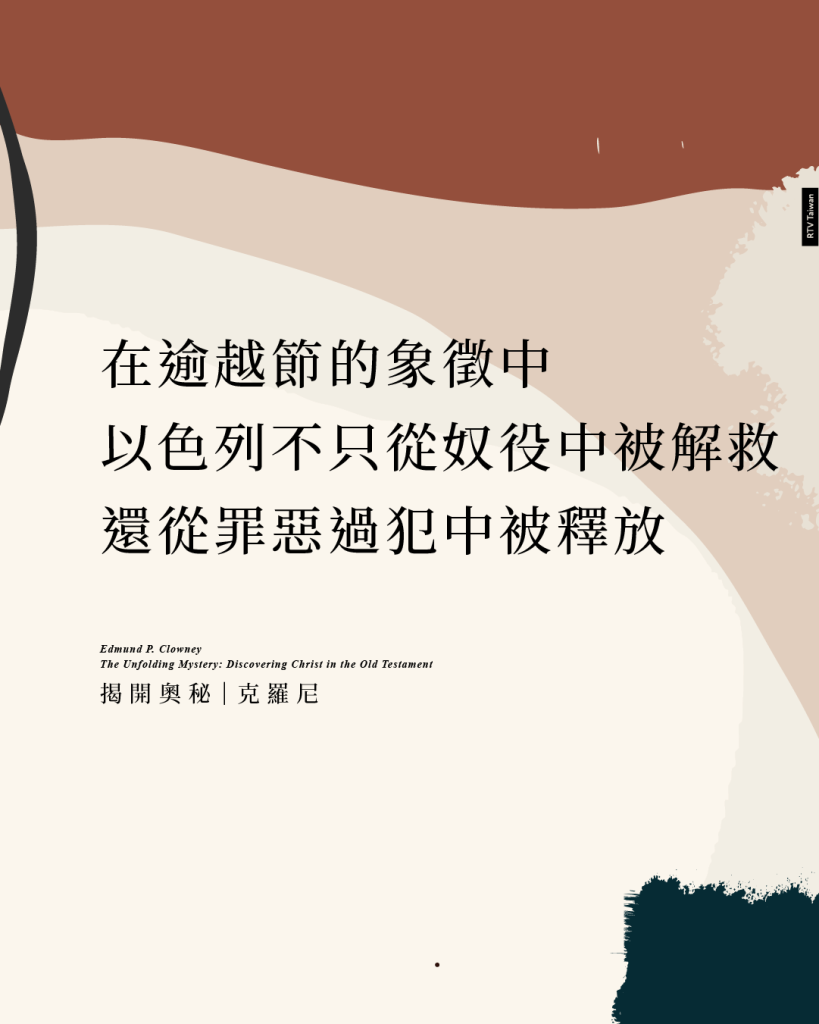 在逾越節的象徵中,以色列不只從奴役的重擔中被解救出來,他們還從罪惡過犯中被釋放出來。當他們在吃羔羊肉的時候——就像他們吃平安祭的祭物一樣——表示他們與神的相交關係恢復了,因為神已經提供了救贖之道。他們之所以要穿旅行用的衣著來吃羔羊,是因為神的應許是確定且必會實現的。