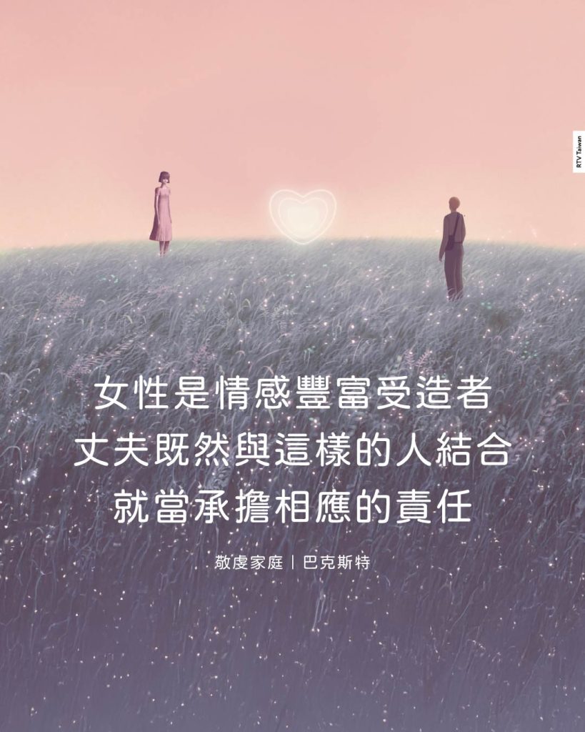 五、別忘了女性多半是情感豐富且熱情的受造者,她們既愛惜自己,自然也期望得到丈夫深切的愛,丈夫既然選擇與這樣性情的人結合,就當承擔相應的責任;若是該付出愛的人卻不去愛,不僅忘恩負義,也是一種無理的鄙夷;
