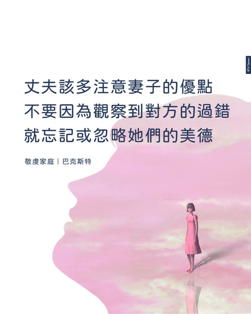 八、丈夫該多注意妻子身上的優點、而非缺點;不要因為觀察到對方的過錯,就忘記或忽略了她們的美德;看見對方的愛或善良,也會點燃自己心中的愛;