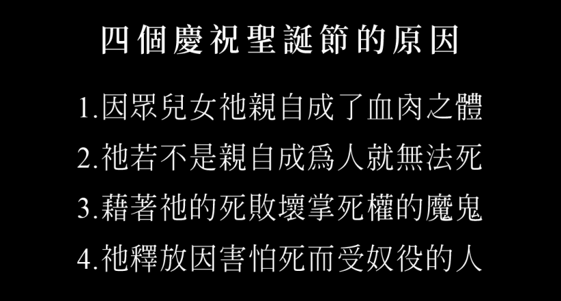 第三個原因,因為祂死了,所以藉著死,祂就能消滅魔鬼。第四個原因祂消滅魔鬼──掌死權的魔鬼,祂就能釋放我們脫離奴役,那些害怕死亡,一生因害怕死亡而受奴役的人。希伯來書作者的前提是:每個人都非常怕死,這深層潛意識的懼怕,使我們一生成為奴隸。但是,但是我們已經被釋放,藉著基督的大能──在祂的死中敗壞了魔鬼的工作。這事能成,是因為祂死了,這事能成,是因為祂親自成了血肉之體。這就是聖誕節發生的原因。