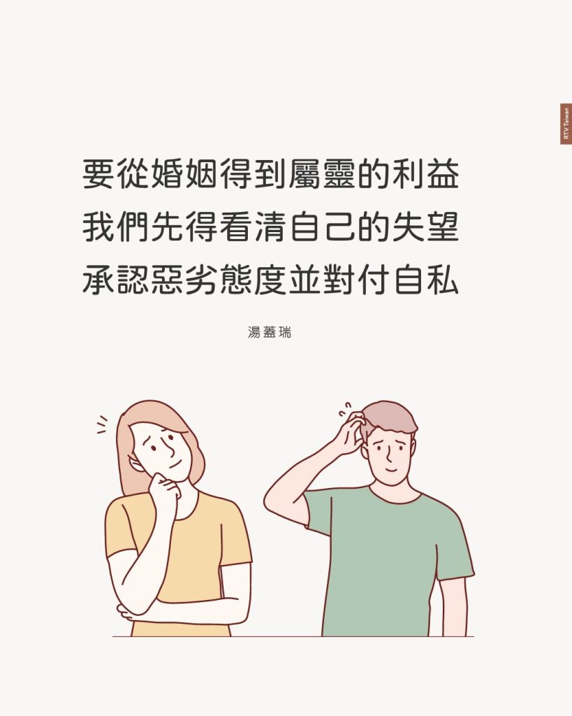 作家湯蓋瑞(Gary Thomas)說:「要從婚姻得到屬靈的利益,我們必須誠實。我們一定得看清自己的失望,承認自己惡劣的態度,並對付自己的自私。我們還得讓自己擺脫一種觀念,即婚姻的困難只要極力禱告或學習幾個簡單的原則就可以克服。我們多半都已發覺這些『簡單的步驟』只有膚淺的作用。