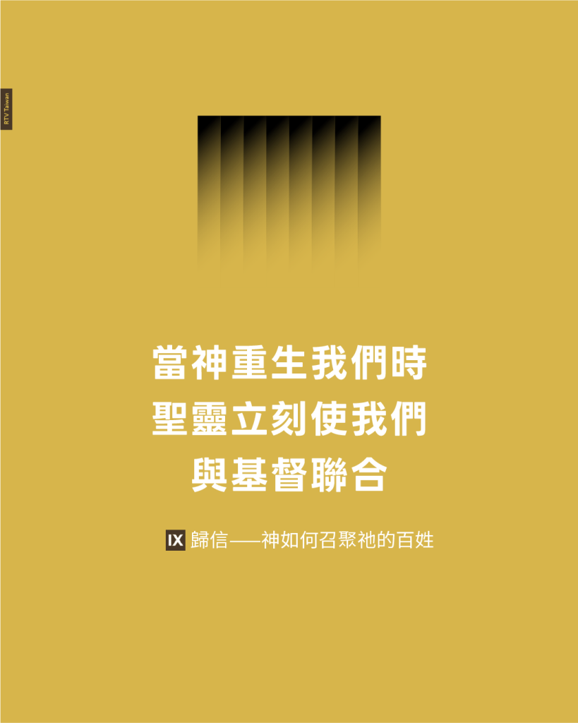 當神重生我們時,聖靈立刻使我們與基督聯合。在這種聯合中,聖靈把聖子已做成的全部成果——祂復活的生命、公義和恩典——全部歸到了我們身上。