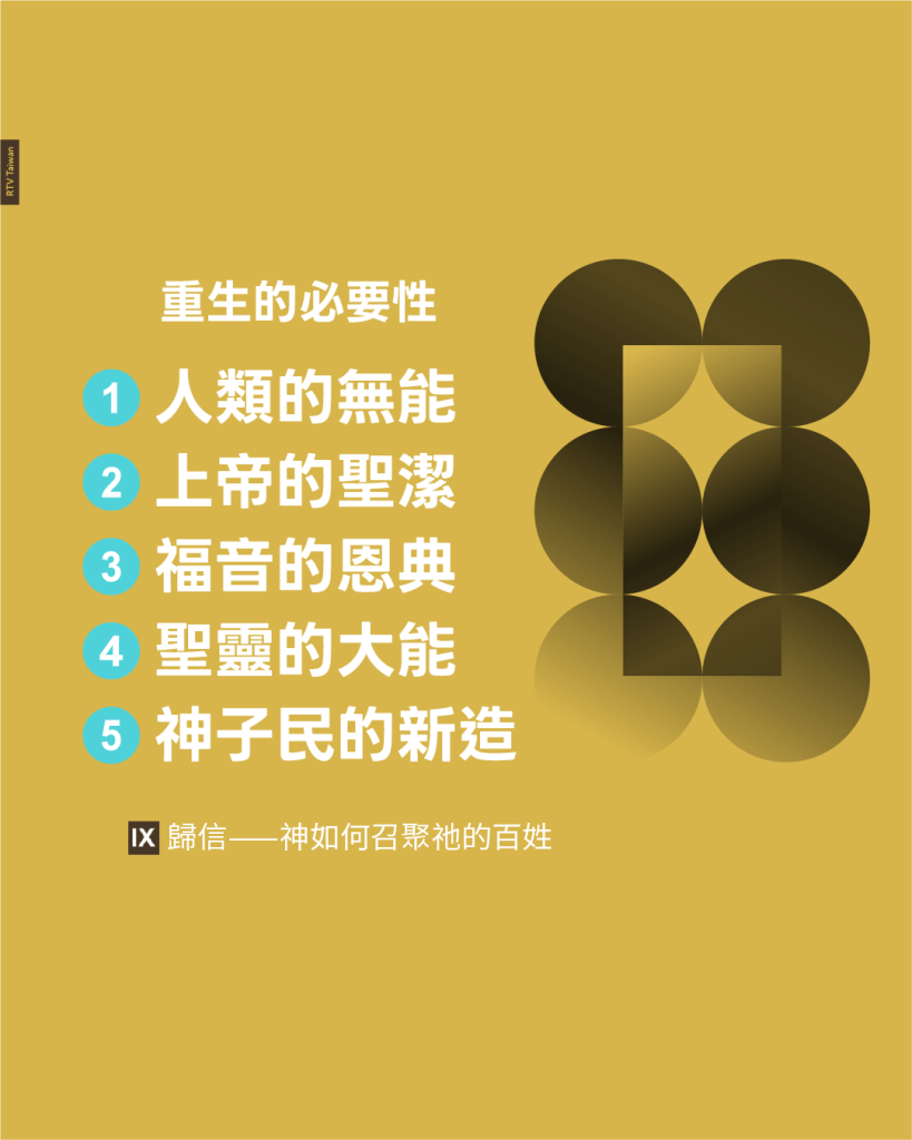 重生的必要性源於五個方面的聖經真理:人的無能、神的聖潔、福音的恩典、聖靈的大能和屬神子民的新造。