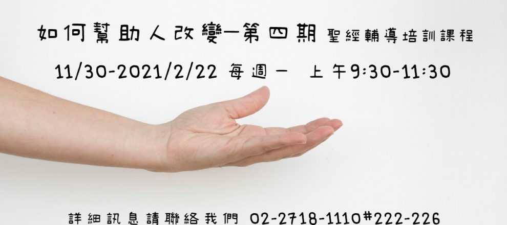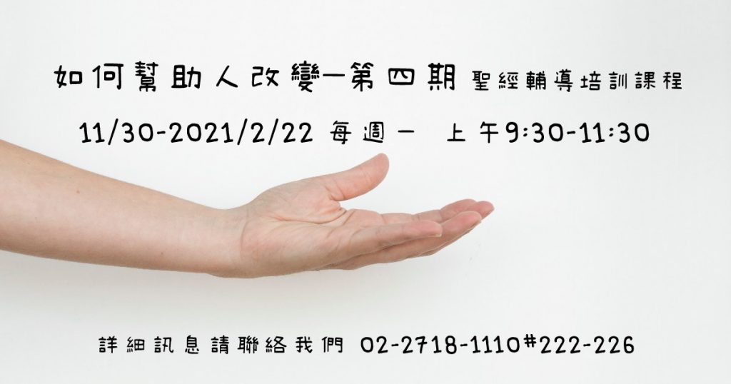 【如何幫助人改變–第四期】聖經輔導培訓課程最新消息2020-11-10 2020-11-10 我如何幫助身邊的人改變?改變,又是如何發生的?信仰為何在生活中起不了作用?信仰即生活,生活即信仰。 這門「如何幫助人改變」聖經輔導培訓課程,幫助我們成為救贖主手中的器皿,在古舊福音中,與他人一同經歷生命蛻變的喜悅與悸動。 報名網址 FCC珍愛家庭中心 文章導覽 Previous Post [憶起走過] 免費健康講座 主恩教會最新消息2020-11-10Next Post 聰明人不聲張自己的智慧(馬太亨利)清教徒, 精選文章2020-11-11