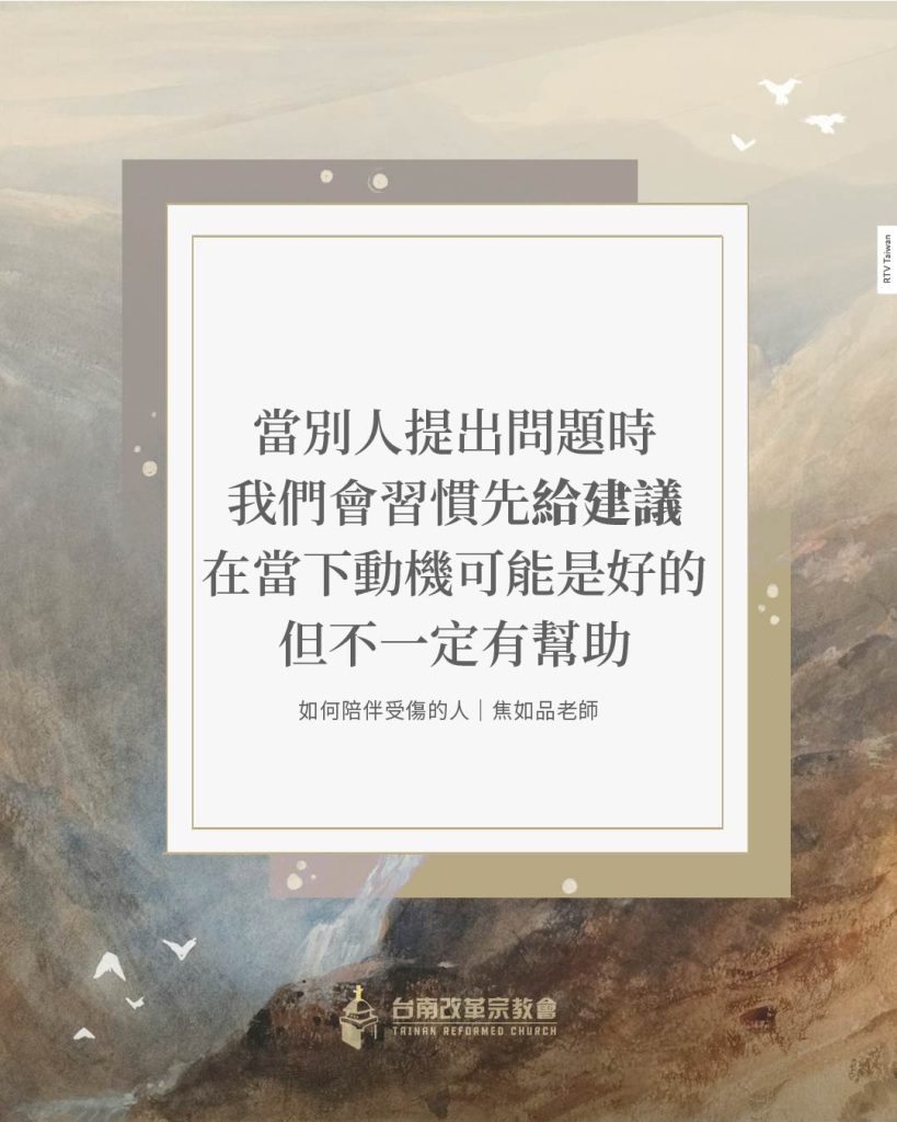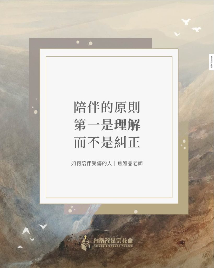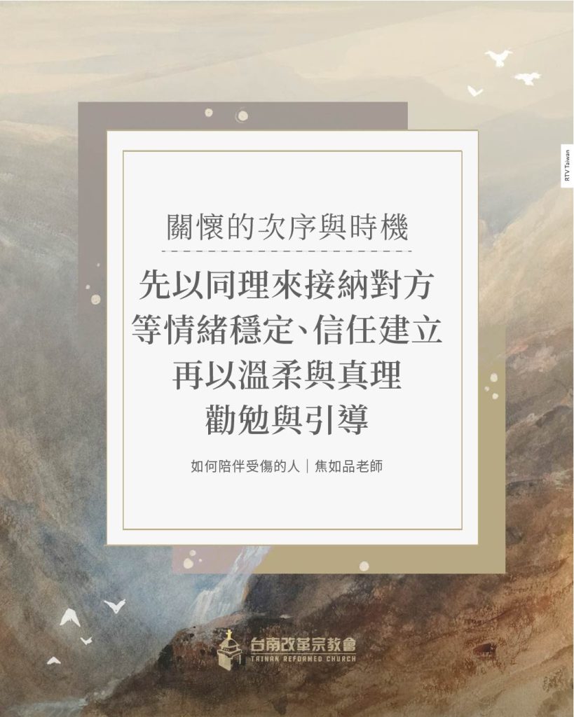 我們先以同理與安慰接納彼此的痛苦,使受傷的心在關係中得著安全與理解;等到情緒逐漸穩定、信任被建立之後,再以溫柔與真理彼此勸勉與引導。