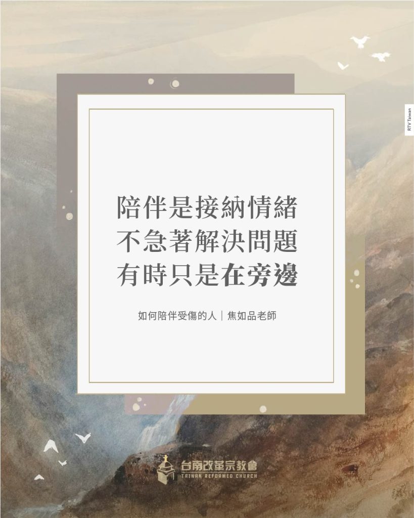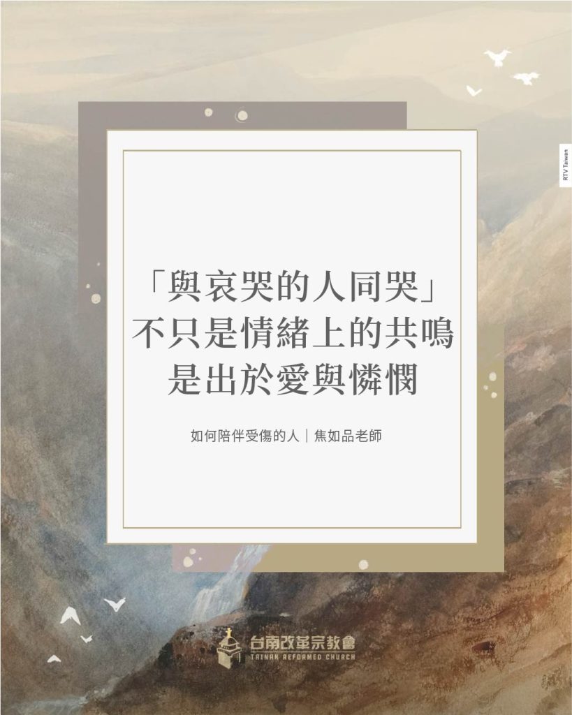 聖經教導我們要與哀哭的人同哭(羅馬書十二章15節),不只是情緒上的共鳴,更是出於愛與憐憫。耶穌基督也常先以憐憫與同在臨到受苦的人,使破碎的心得著安慰,然後再帶來真理的光照與生命的更新。