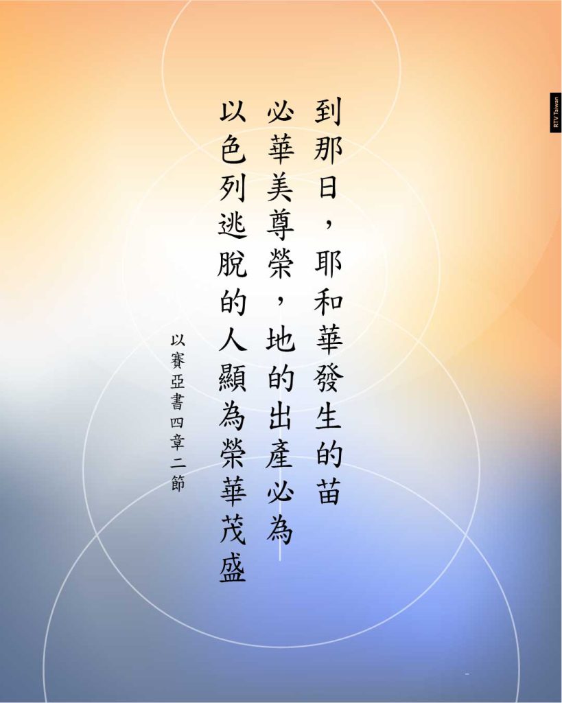 2 到那日,耶和華發生的苗必華美尊榮,地的出產必為以色列逃脫的人顯為榮華茂盛。 3-4 主以公義的靈和焚燒的靈,將錫安女子的污穢洗去,又將耶路撒冷中殺人的血除淨。那時,剩在錫安、留在耶路撒冷的,就是一切住耶路撒冷、在生命冊上記名的,必稱為聖。 5 耶和華也必在錫安全山,並各會眾以上,使白日有煙雲,黑夜有火焰的光。因為在全榮耀之上必有遮蔽。 6 必有亭子,白日可以得蔭避暑,也可以作為藏身之處,躲避狂風暴雨。(以賽亞書四章2到6節)