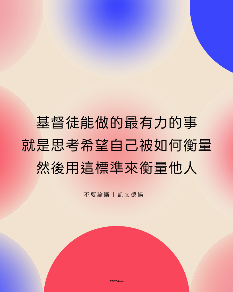 在一個充斥著鍵盤俠和網路審判的時代,基督徒可以做的最有力的一件事就是思考我們希望自己被如何衡量,然後用這個標準來衡量他人。我希望別人如何評價我?我希望人們從每一個角度全面地來看待我,而不是急於相信某一個關於我的最壞的評價;我希望人們認真瞭解事實,而不是道聽塗說輕信八卦或猜測;我希望人們能給我一個公平的機會聽我自白,並願意改變他們的想法;我希望人們以尊重的態度對待我。這不就是你希望人們衡量你的方式嗎?那麼這是你和我衡量別人的方式嗎?