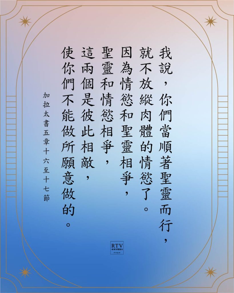 當然,這不是說他永不會達到任何程度的義,保羅並非預料基督徒生命是經常完全失敗的,反而,他期望這是不斷的道德成長。「⋯⋯當順著聖靈而行,就不放縱肉體的情慾了。」這是加拉太書五章十六節對信徒的直接要求,第十七節只不過是這要求的註腳而已。明顯地,保羅在這裏及其他經文教導有關基督徒品行時,他每每期望信徒努力向前,養成聖潔的習慣,積極操練自己,學像基督。pp37-39