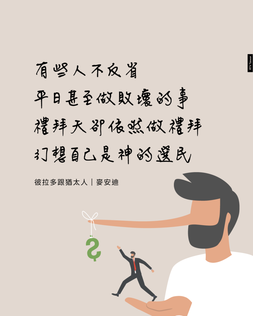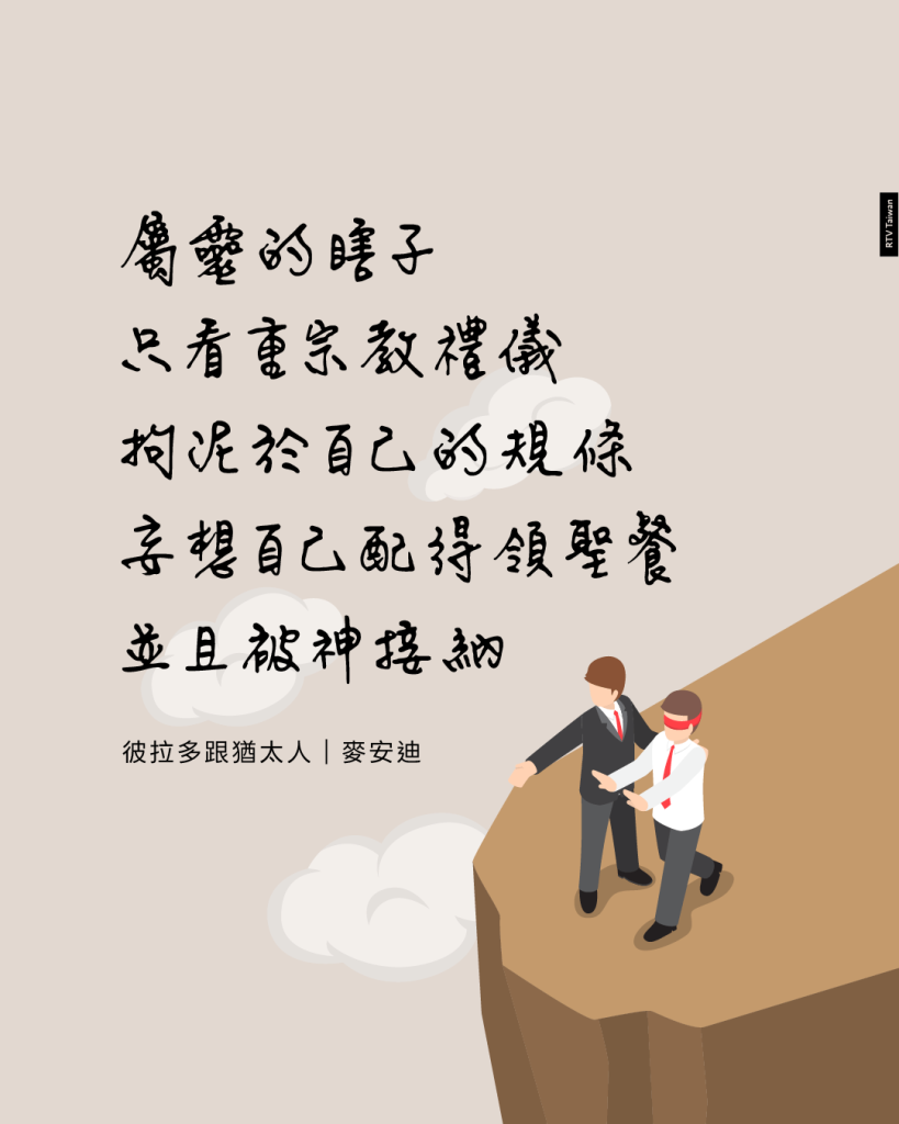 屬靈的瞎子的意思是:你會看重宗教的禮儀,發明很多你自己的規則。你會想:我遵守了這些規則,我就是配得領聖餐的,我就是在神的面前會被接納的那一位。但同時間,我們的生命,從禮拜一到禮拜六,卻不知道怎麼分善和惡。恐怕很多人都認為自己為基督徒,但有時候這樣的,恐怕有的時候,人若沒有被提醒,我們也會妄想我們是聖潔的,別人都不聖潔,因為我們有遵守許多的規則,我們會很容易這樣子想。我們禮拜天來教會,彷彿跟禮拜一到禮拜六的生活分開。每一個人都有這個危險。若你不反省,沒有活在神的面前,甚至禮拜一到禮拜六可以繼續做敗壞的事——這有點丟臉,但禮拜天就是繼續來教會做禮拜,幻想自己是神的選民。