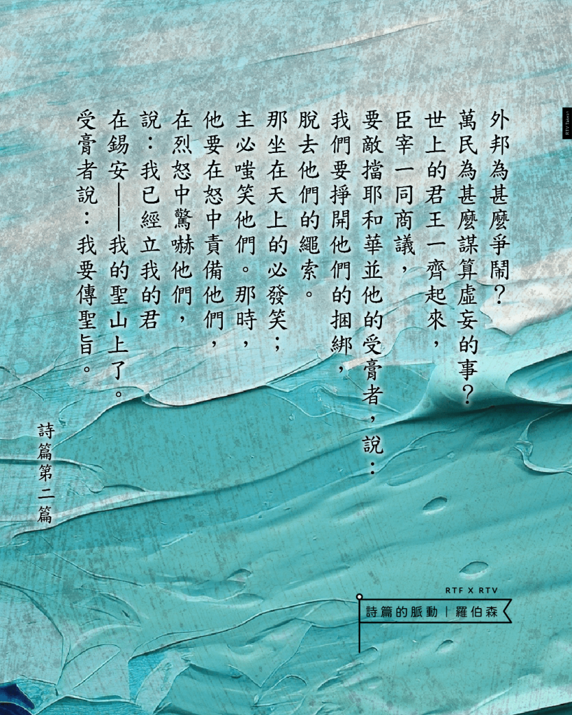 1 外邦為甚麼爭鬧?萬民為甚麼謀算虛妄的事? 2 世上的君王一齊起來,臣宰一同商議,要敵擋耶和華並他的受膏者, 3 說:我們要掙開他們的捆綁,脫去他們的繩索。 4 那坐在天上的必發笑;主必嗤笑他們。 5 那時,他要在怒中責備他們,在烈怒中驚嚇他們, 6 說:我已經立我的君在錫安─我的聖山上了。 7 受膏者說:我要傳聖旨。耶和華曾對我說:你是我的兒子,我今日生你。 8 你求我,我就將列國賜你為基業,將地極賜你為田產。 9 你必用鐵杖打破他們;你必將他們如同窯匠的瓦器摔碎。 10 現在,你們君王應當省悟!你們世上的審判官該受管教! 11 當存畏懼事奉耶和華,又當存戰兢而快樂。 12 當以嘴親子,恐怕他發怒,你們便在道中滅亡,因為他的怒氣快要發作。凡投靠他的,都是有福的。(詩篇第二篇)