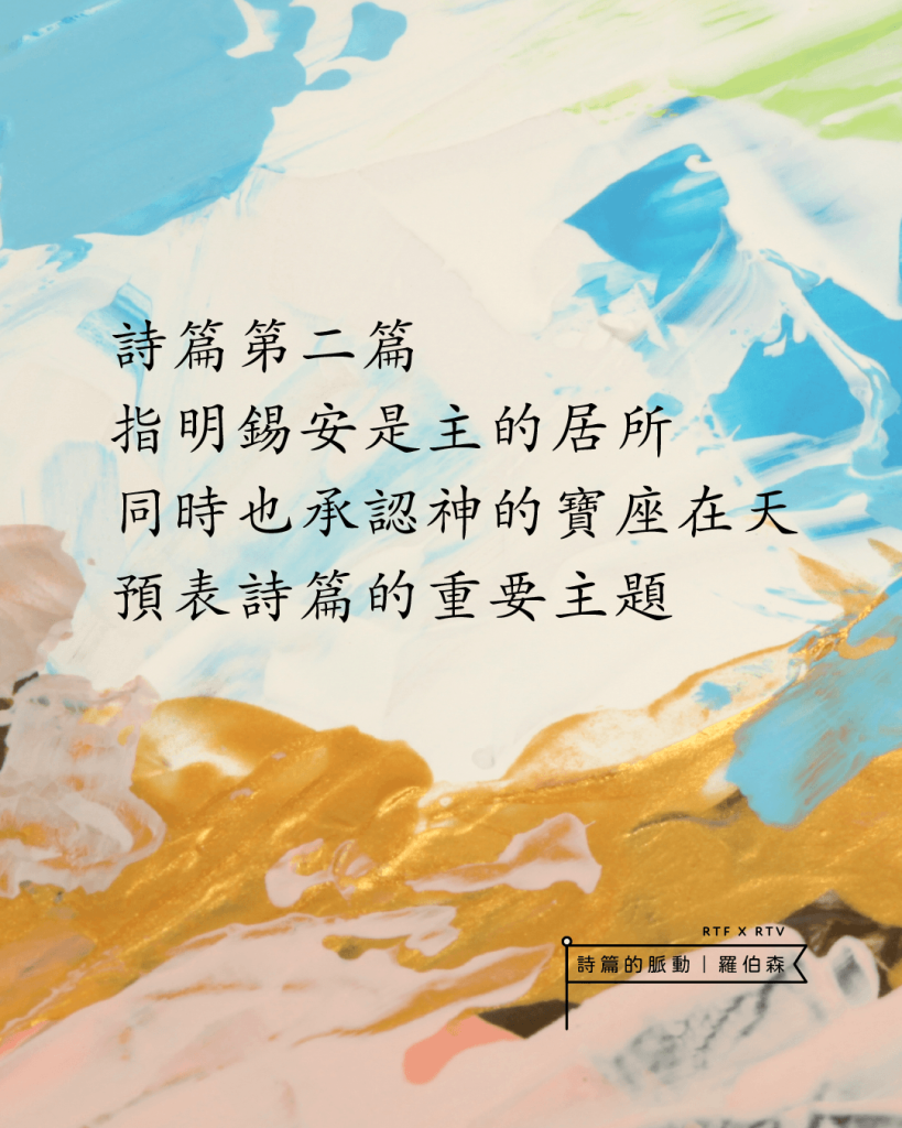 詩人在詩篇第二篇宣稱耶和華「坐在天上」(二4)。然而,就在這首開篇詩篇中,主自己指明「錫安——我的聖山」(二6)。在詩篇整卷書中,錫安被認定是耶和華王權的所在地。這種看似二分法的情況對聖經並不構成問題。大衛之約的一個基本要素在於,大衛的後裔要為主建造一個「家」(house),祂要在那裡與祂的百姓同住,預示所羅門建造聖殿(參撒下七13)。當所羅門獻殿時,他指出神的居所就在錫安,儘管祂在天上治理。所羅門祈求這位主(天和天上的天尚且不足祂居住),從天上垂聽在「此處」立為祂名居所的禱告(參王上八 27-30)。這不僅關乎「名的居所」,因為在所羅門禱告之前,主的「榮光」已經充滿在殿中,顯示耶和華永遠住在錫安山的至聖所中(參王上八 10-11)。