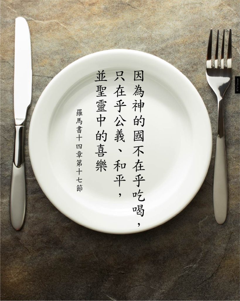 因為神的國不在乎吃喝,只在乎公義、和平,並聖靈中的喜樂。(羅馬書十四章第17節)