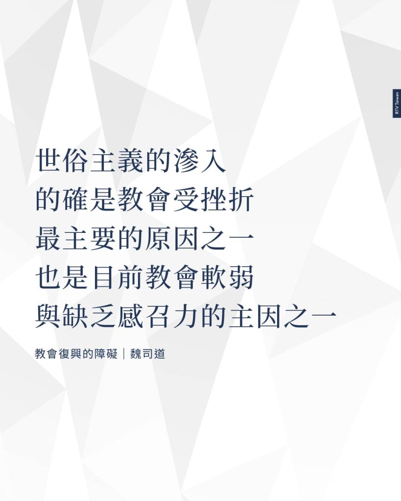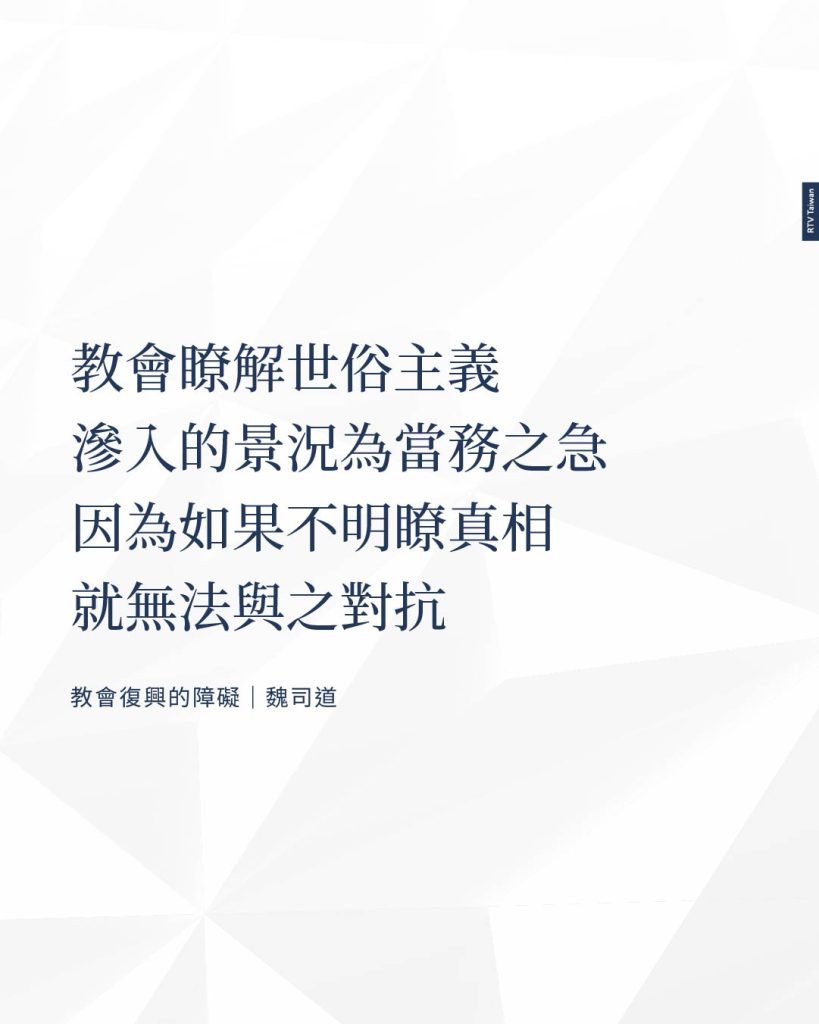 世俗主義的滲入,的確是教會受挫折最主要的原因之一,也是目前教會軟弱與缺乏感召力的主因之一。瞭解目前的景況乃為當務之急,因為如果不明瞭真相,我們就無法與之對抗。pp26-28