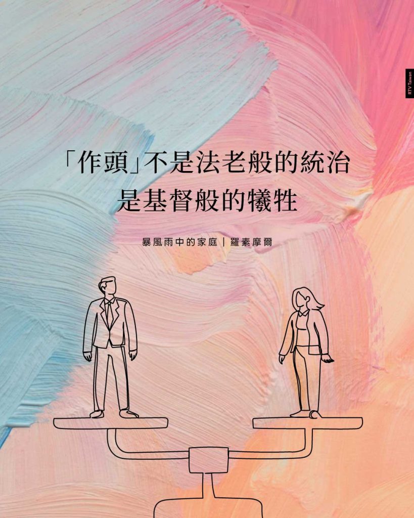 丈夫的領導不是「女人,倒茶來!」也不是「比較屬靈」一點的版本:「蒙福的老婆,請幫我倒茶,然後我們一起來禱告。」正是與此恰恰相反。當頭是要把權力地位釘十字架,以期能愛妻子「正如基督愛教會,為教會捨己,以水藉著道把教會洗淨,使她成為聖潔,好獻給自己,作榮耀的教會,毫無玷汙、皺紋等類的缺陷,而是聖潔沒有瑕疵的」(弗五25~27)。