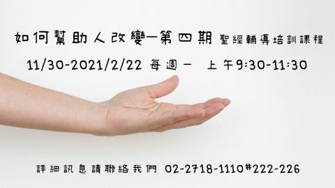 【如何幫助人改變–第四期】聖經輔導培訓課程最新消息2020-11-10 2020-11-10這門「如何幫助人改變」聖經輔導培訓課程,幫助我們成為救贖主手中的器皿,在古舊福音中,與他人一同經歷生命蛻變的喜悅與悸動。