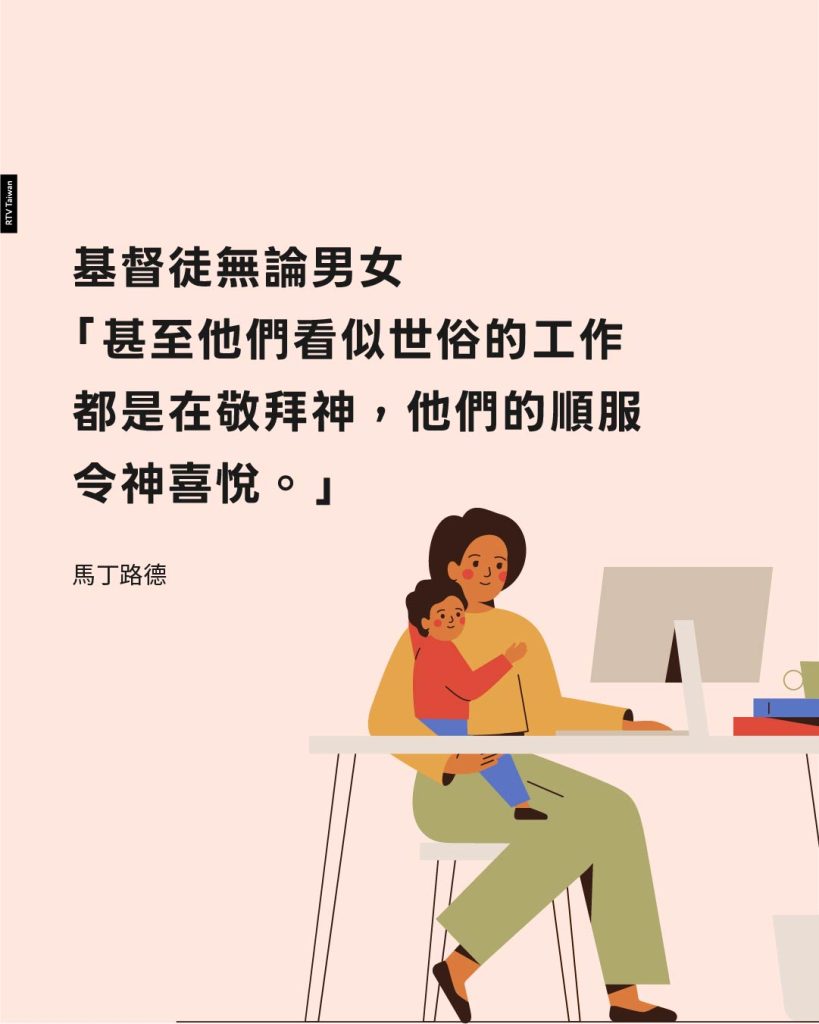 這些觀點恰恰和路德(1483-1546)對於工作的觀點截然相反。作為一名成熟的新教神學家——也是第一位新教神學家!——他將工作重塑為一種呼召或是天職。在天主教神學中,工作的重要性由屬靈程度而定,而不以世俗中的現實評定。祭司與神最親近,因此祭司的工作最為重要。但在聖經中,路德發現了聖經中的閃耀真理:所有生命都應該活在神面前(林前 10:31)。據此,路德認為基督徒無論男女,「甚至他們看似世俗的工作都是在敬拜神,他們的順服令神喜悅。」家務勞動也是如此,它可能「沒有神聖的外表……然而,這些與家庭有關的工作,比所有修道士和修女的所有工作都更令人嚮往,不管修道士和修女的工作多麼辛苦與令人印象深刻。」