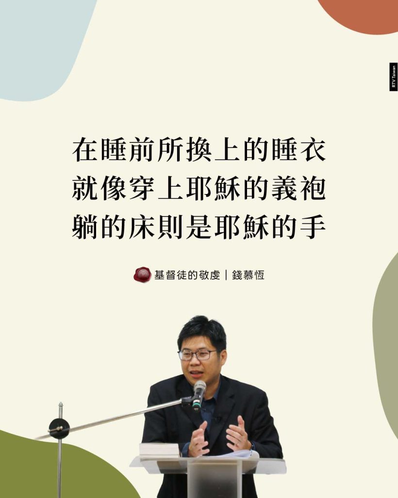 每一天躺下睡覺的時候,都在複習怎麼過世,怎麼離開這個世界,怎麼面對死亡。每一次當你換上睡衣的時候,很多人喜歡睡覺時候有一套睡衣,就好像在離開世界的時候,耶穌的義袍加在你身上的時候。換好睡衣,躺下溫暖的床睡覺,這個床就是耶穌基督的手。