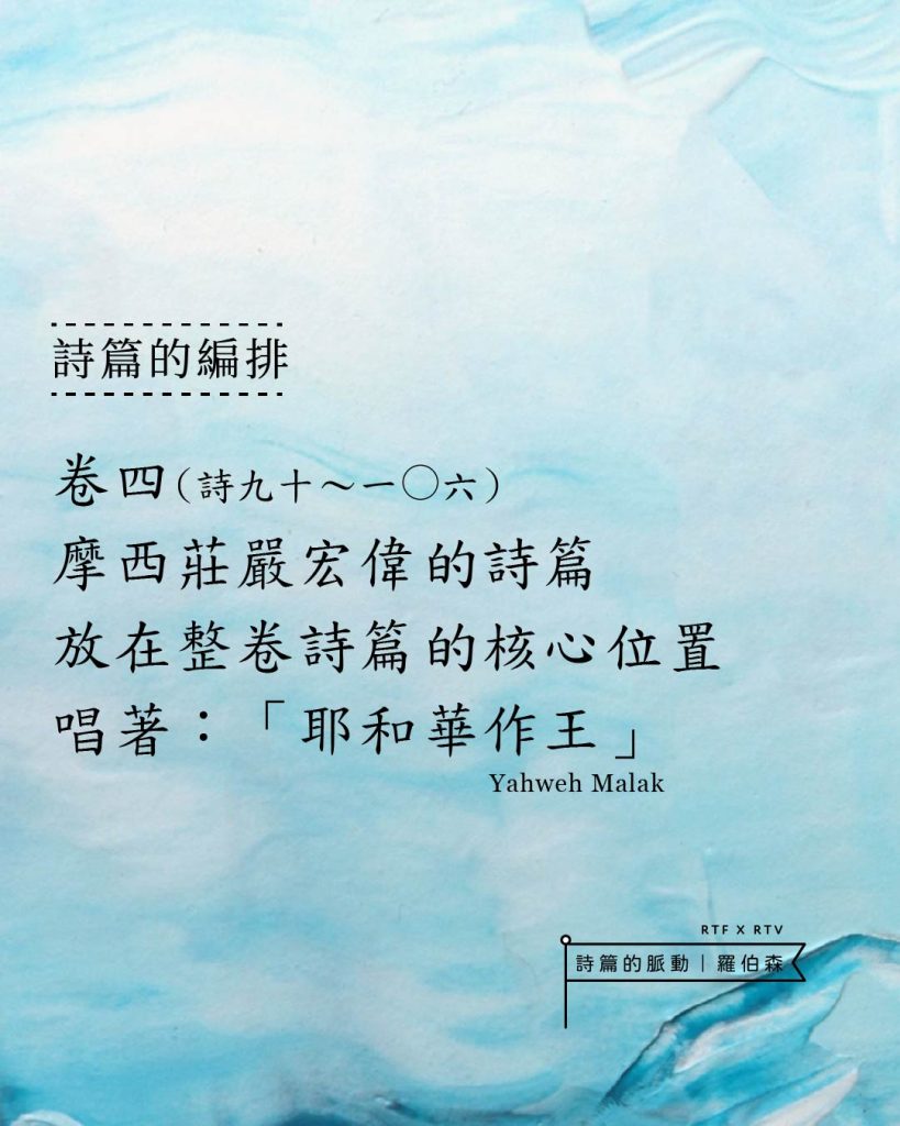 接著,他提供真實的圖像,描繪與外邦勢力中大能的「角」的衝突,最終祂的百姓遭毀滅,彌賽亞的冠冕被拋在塵埃中(卷三,詩七十三~八十九)。為了回應這慘況,他把摩西莊嚴宏偉的詩篇放在整卷詩篇最重要的核心位置。因此,這首威嚴的詩篇就成為卷四的引言,引領神子民對神國的降臨有更成熟的觀點(卷四,詩九十~一〇六):