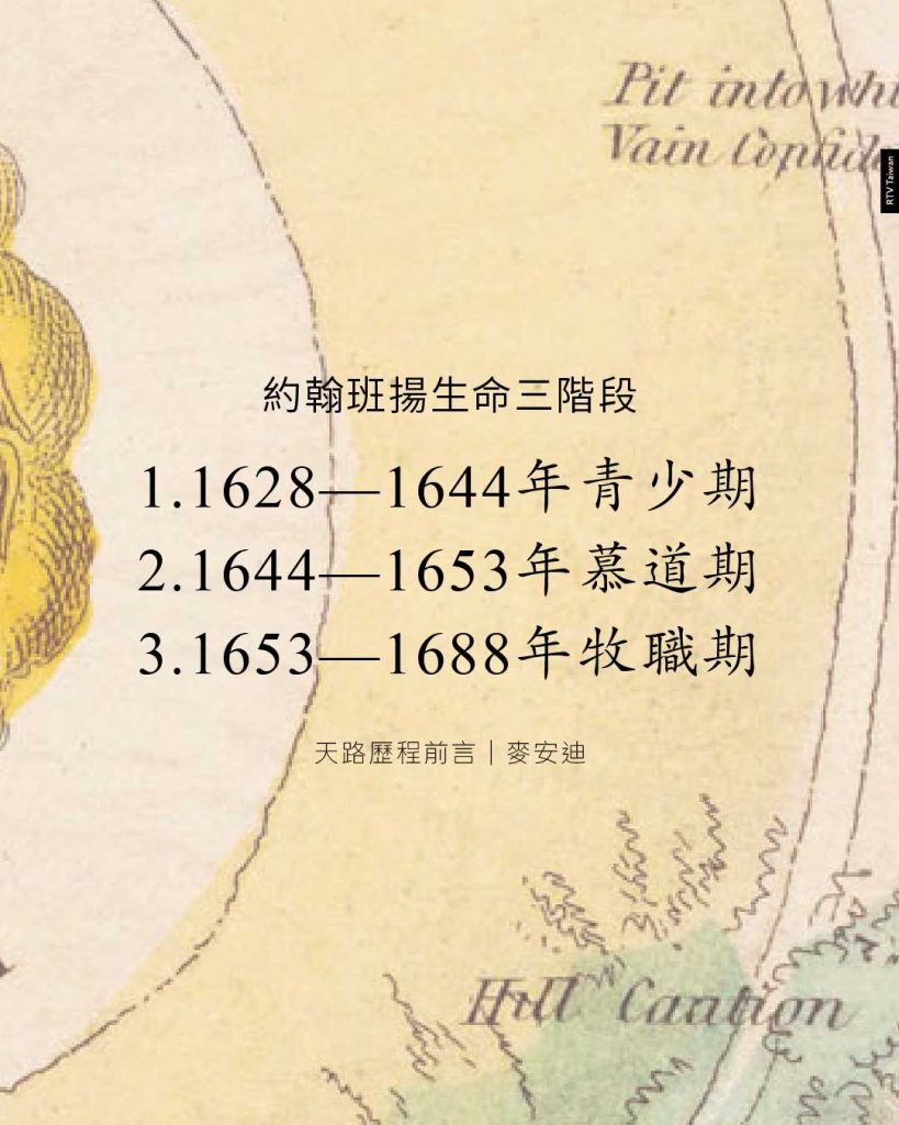 到了1690年,英國才逐漸轉向宗教自由。當時的國王改信天主教,英國百姓請他退位,並迎回威廉與瑪麗,建立起宗教自由。正是在這樣的時代背景中,約翰·班揚出現。我們可以把他的生命分成三個階段:他在1628年出生,1644年以前是青少年時期;1644年至1653年之間是慕道期;從1653年到大約1688年則是他的牧職期。他信主不到六年,就已經成為一位重要的講員。可見他剛信主的時候,還在清教徒掌權的自由時期;等到1660年國王復辟,教會再度受到逼迫,而班揚因為名聲大,很快就被逮捕。