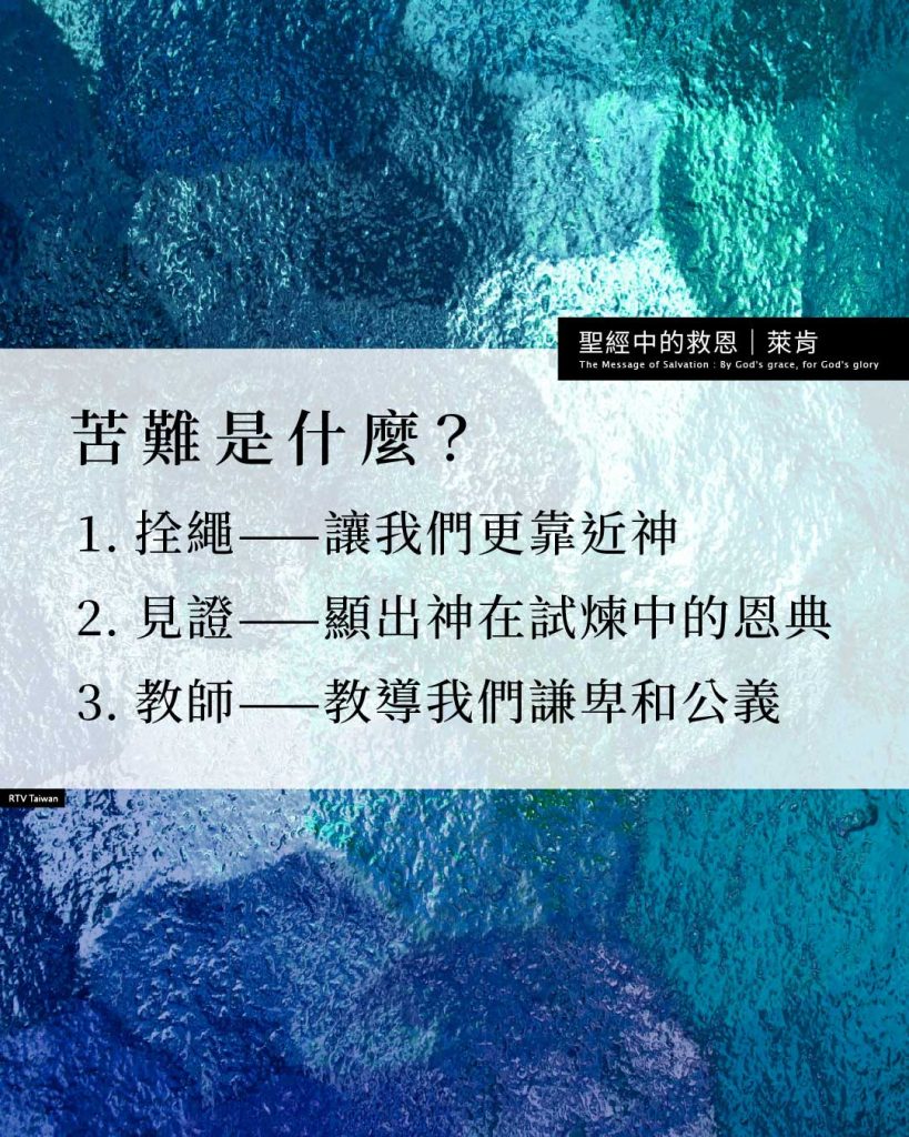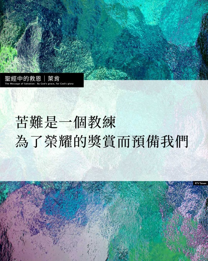 如詩人所說,「我未受苦以先走迷了路,現在卻遵守你的話。」苦難是一個教練,為了榮耀的獎賞,預備我們。彼得所列舉的尚未完全,根據希伯來書,苦難是神管教祂真兒女的方法。如耶穌說的,「凡我所疼愛的,我就責備管教他」。這樣的管教,不是懲罰,也不是要摧毀,乃是為要救贖,「是要我們得盆處,使我們在他的聖潔上有分」。