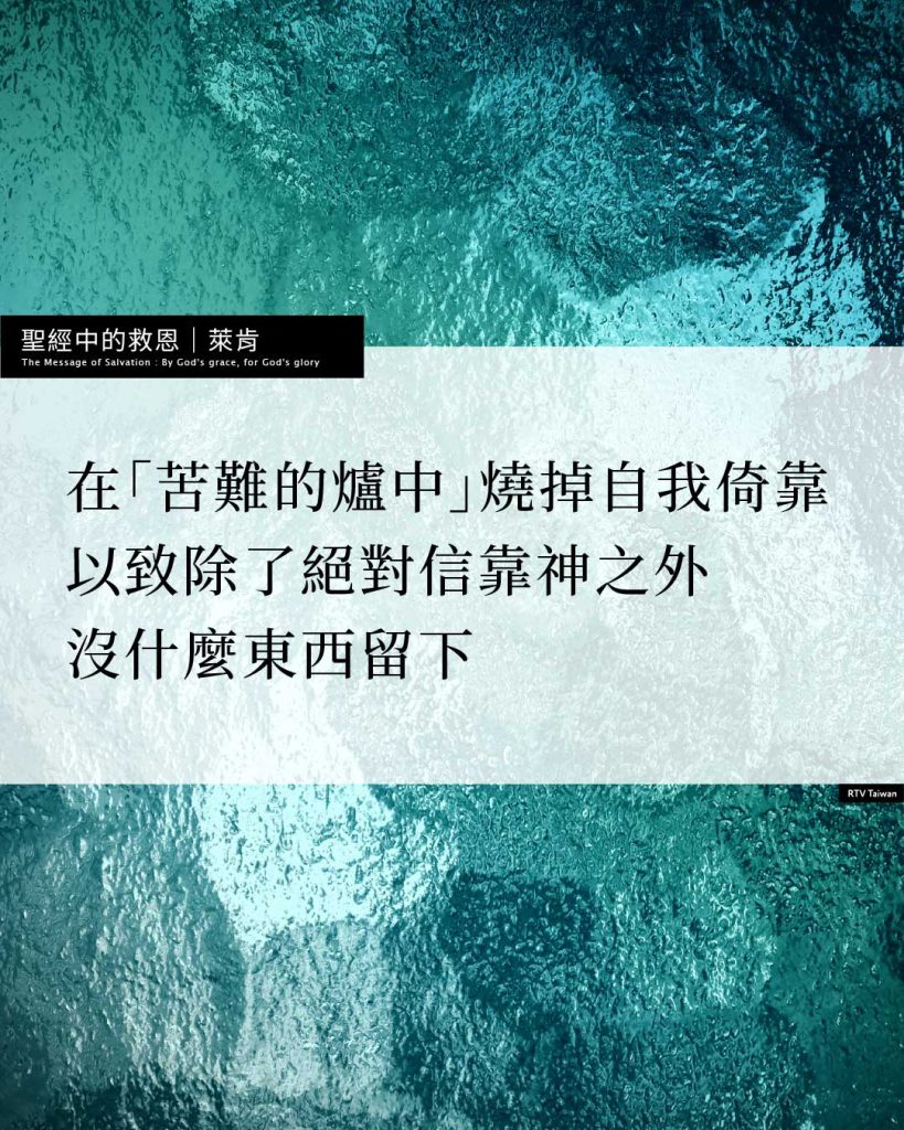 根據煉金屬的標準過程,金礦是藉著火焚精煉,燒掉不純的東西,直到只剩下純金。在神的煉金過程裡,我們的信心也很像這樣被煉淨。在「苦難的爐中」,燒掉我們的自我倚靠,以致除了絕對信靠神之外,沒什麼東西留下。
