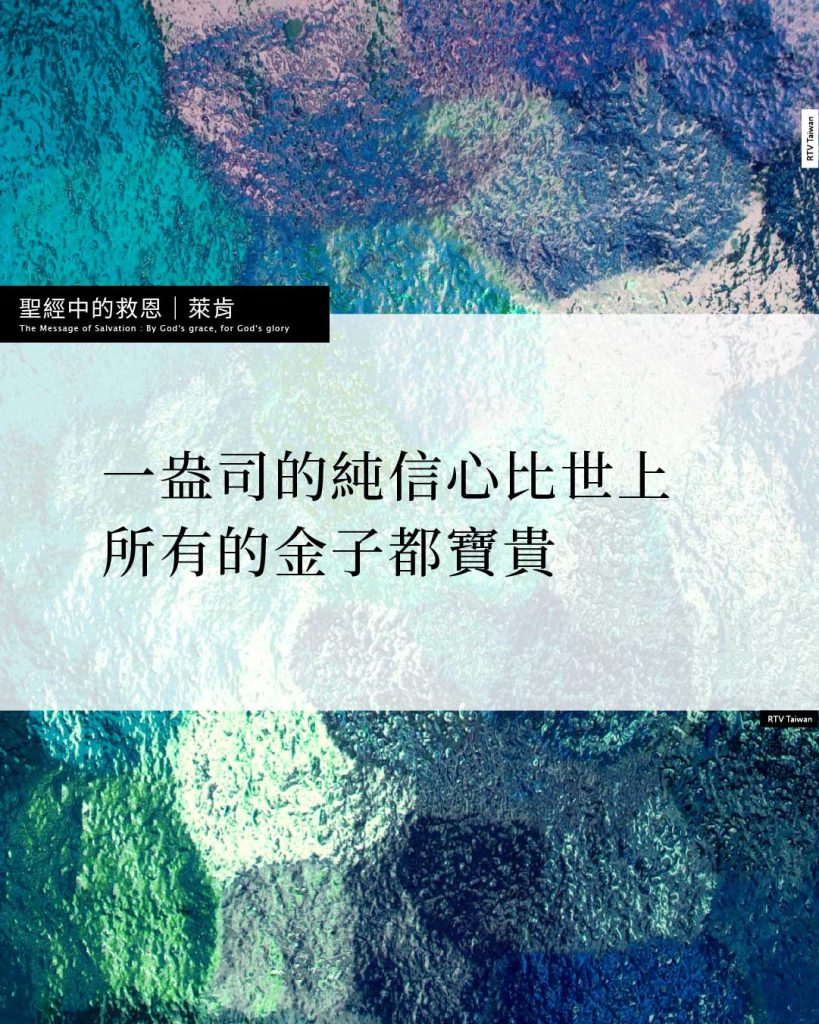 信心比金子是無限地寶貴,因為它永遠不會朽壞。藉著信心,我們把寶貝藏在天上,沒有蟲子咬,不能銹壞,也沒有賊挖窟窿來偷。因此,藉著信心,我們做最好的投資,抓住榮耀,和其一切的燦爛。一盎司的純信心,比世上所有的金子都寶貴。