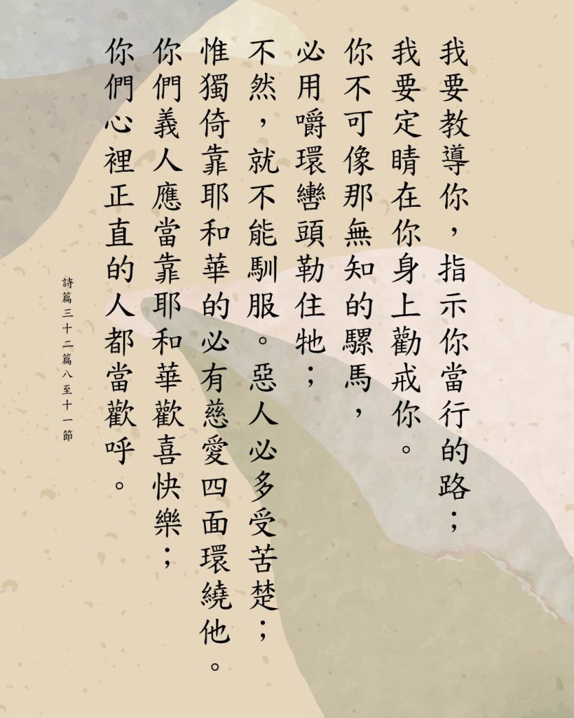 8 我要教導你,指示你當行的路;我要定睛在你身上勸戒你。9 你不可像那無知的騾馬,必用嚼環轡頭勒住牠;不然,就不能馴服。10 惡人必多受苦楚;惟獨倚靠耶和華的必有慈愛四面環繞他。11你們義人應當靠耶和華歡喜快樂;你們心裡正直的人都當歡呼。(詩篇三十二篇8-11節)