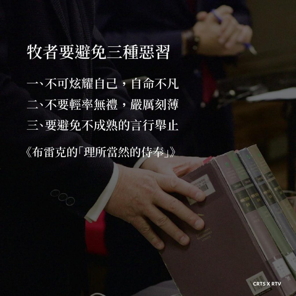 牧者要避免三種惡習改革宗神學院, 精選文章2022-06-17 牧者要避免三種惡習 一、不可炫耀自己,自命不凡二、不要輕率無禮,也不可嚴厲刻薄三、要避免讓人瞧不起的不成熟言行舉止 《布雷克的「理所當然的侍奉」》 公開神學講座:《布雷克的「理所當然的侍奉」》內附超級完整講道大綱 《布雷克的「理所當然的侍奉」》倪安德 文章導覽 Previous Post (推廣片)與主共度的奇妙五小時1(傅格森)傅格森 博士, 林格尼爾, 短篇影片, 精選文章2022-06-16Next Post 看顧羊群的方式(巴克斯特)卡通, 精選文章, 聖經輔導2022-06-17