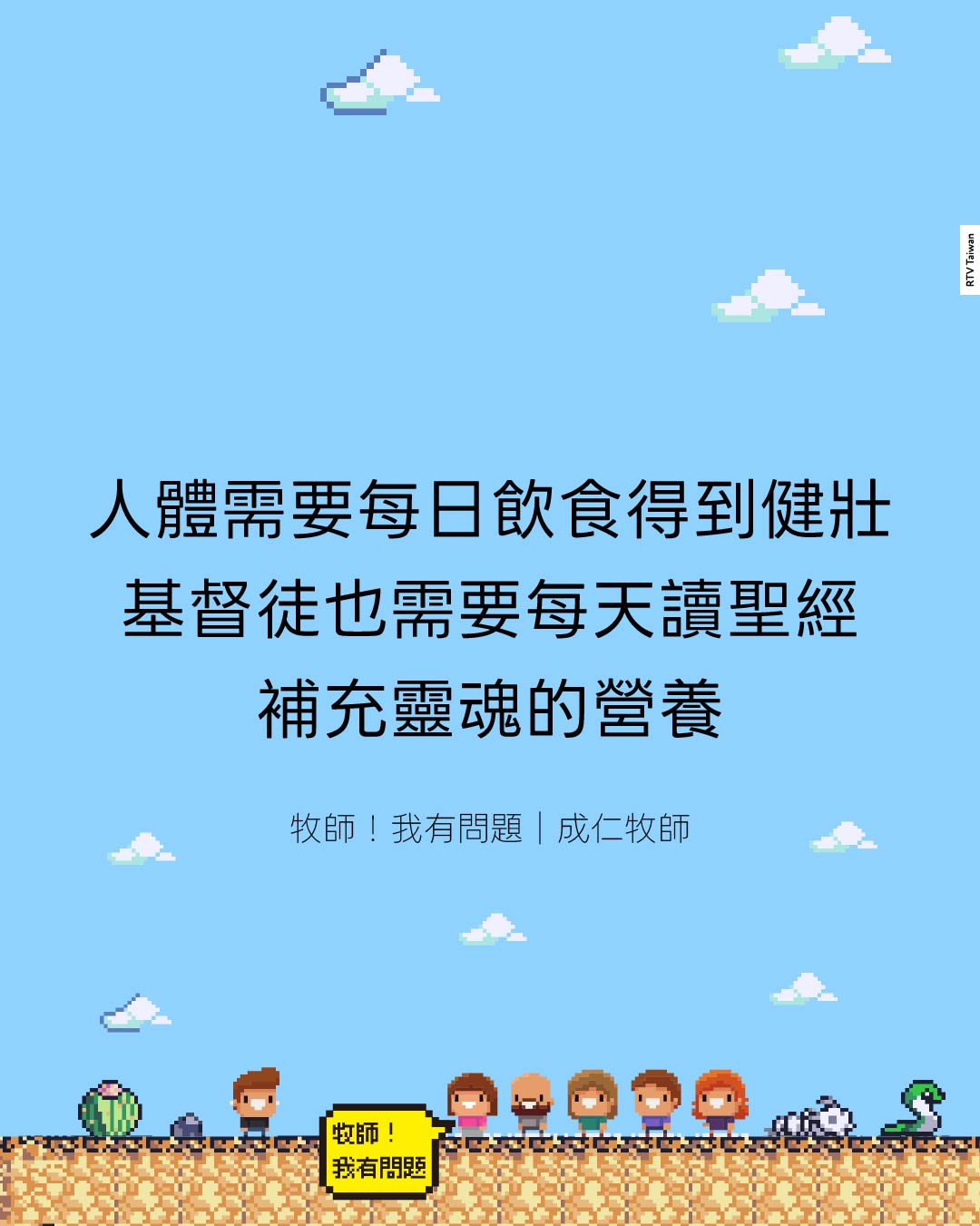 成仁牧師:很好的問題。基督徒都曉得,牧師時常告訴你們,要每天要讀經……事實上的確,每天讀經,就像我們的靈糧。我們人的身體需要飲食,每天飲食來得到健壯;我們基督徒的靈糧,也是要每天需要補充營養,得到訓練。當然,聖經講說不單單是每天。
